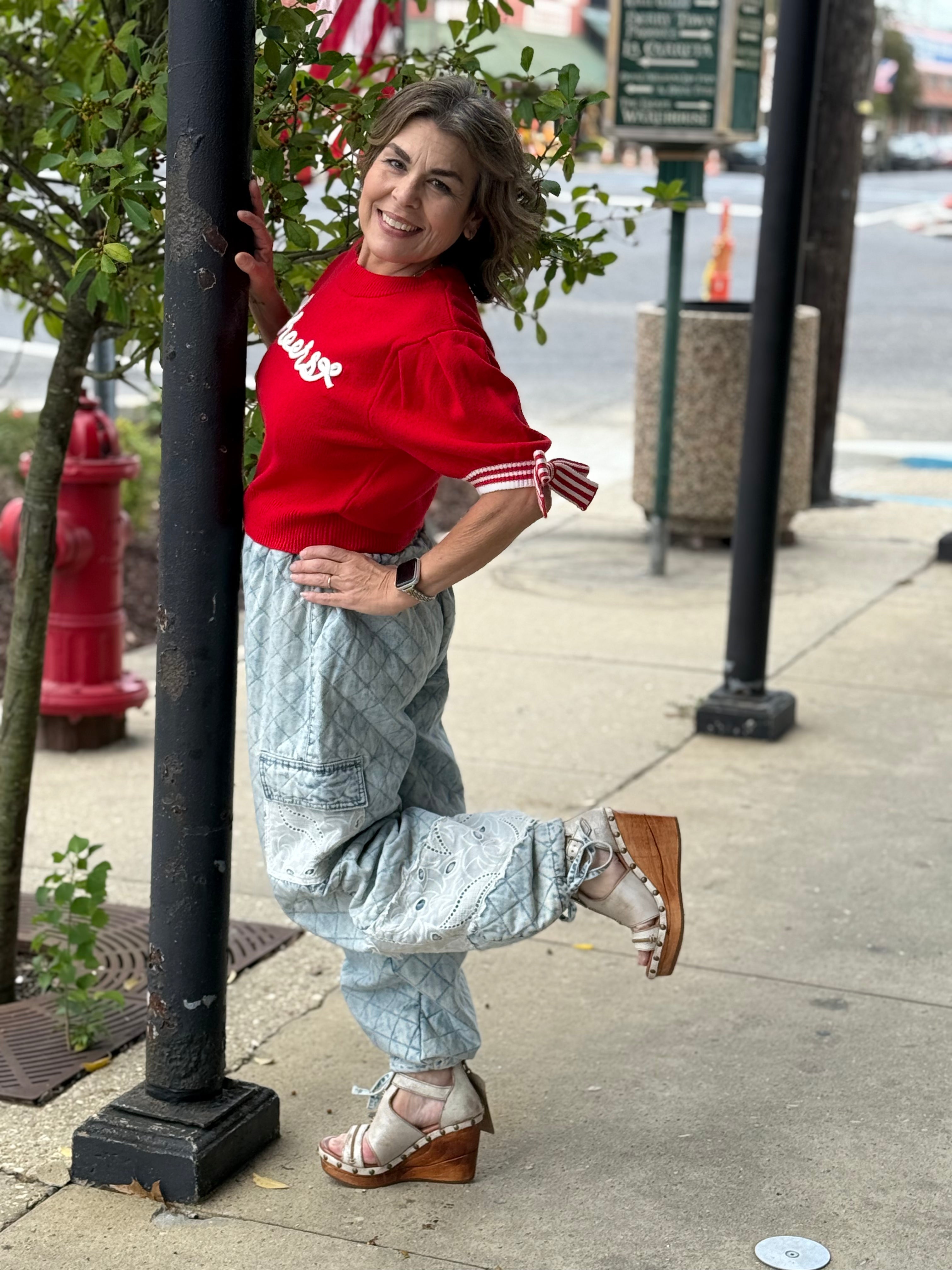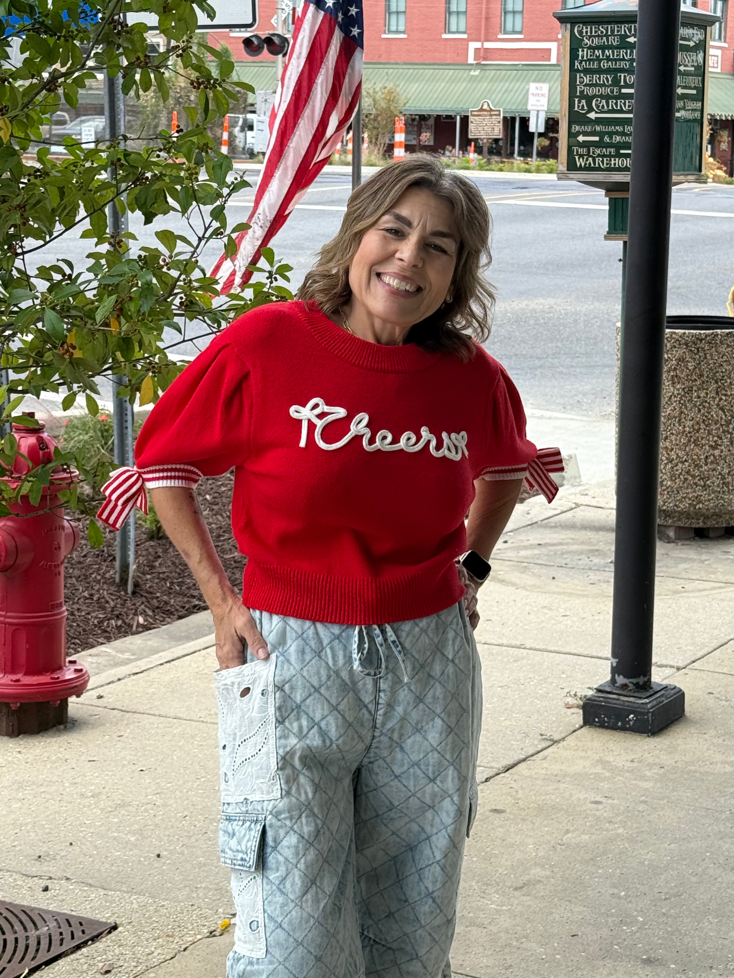 Introducing the Cheers Red Puff Sleeve Sweater. Made with high-quality material for added comfort and style. This sweater boasts a unique and trendy puff sleeve design, perfect for any occasion. Elevate your wardrobe with this must-have piece.
