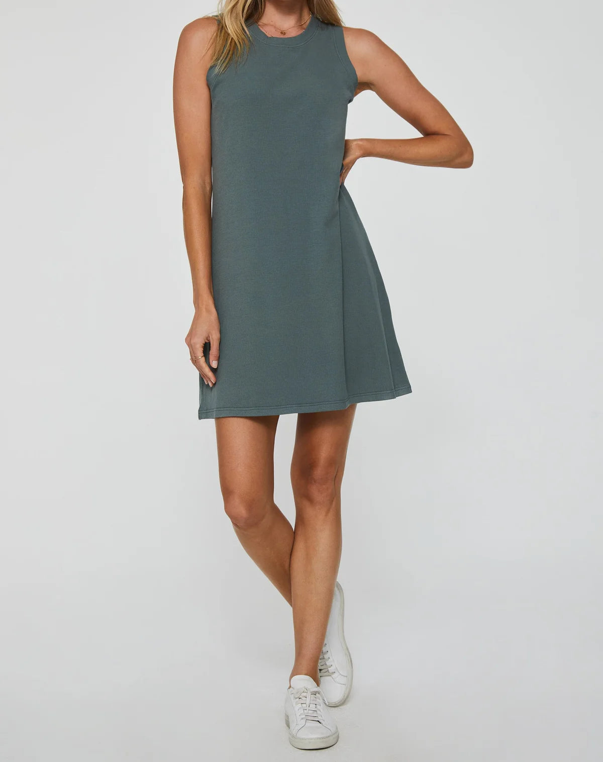 The JUSTINE Rib Dress offers a sleek crew neck, sleeveless design with a comfortable, flattering classic fit. Perfect on its own or layered, it adds effortless elegance to any outfit.