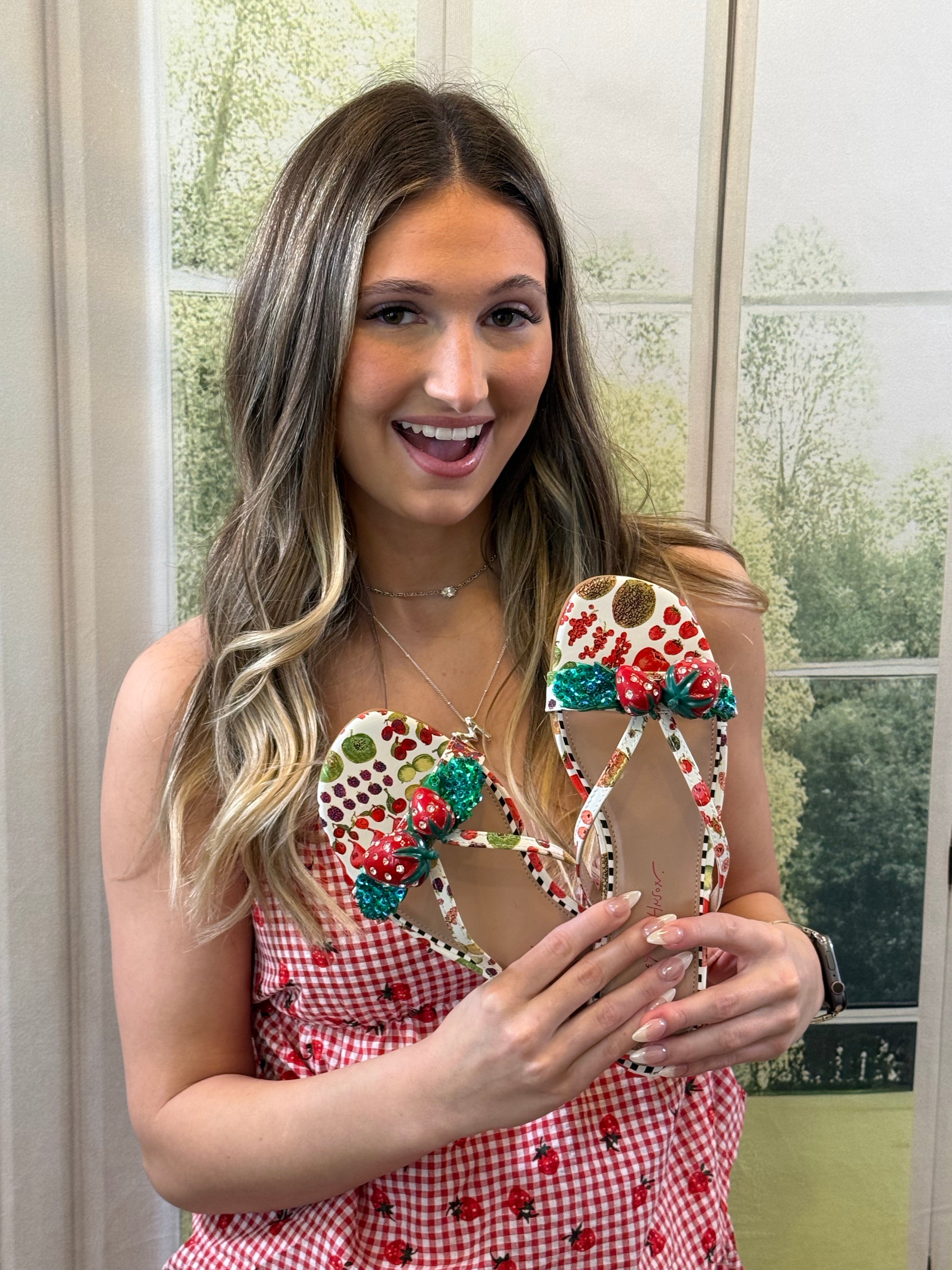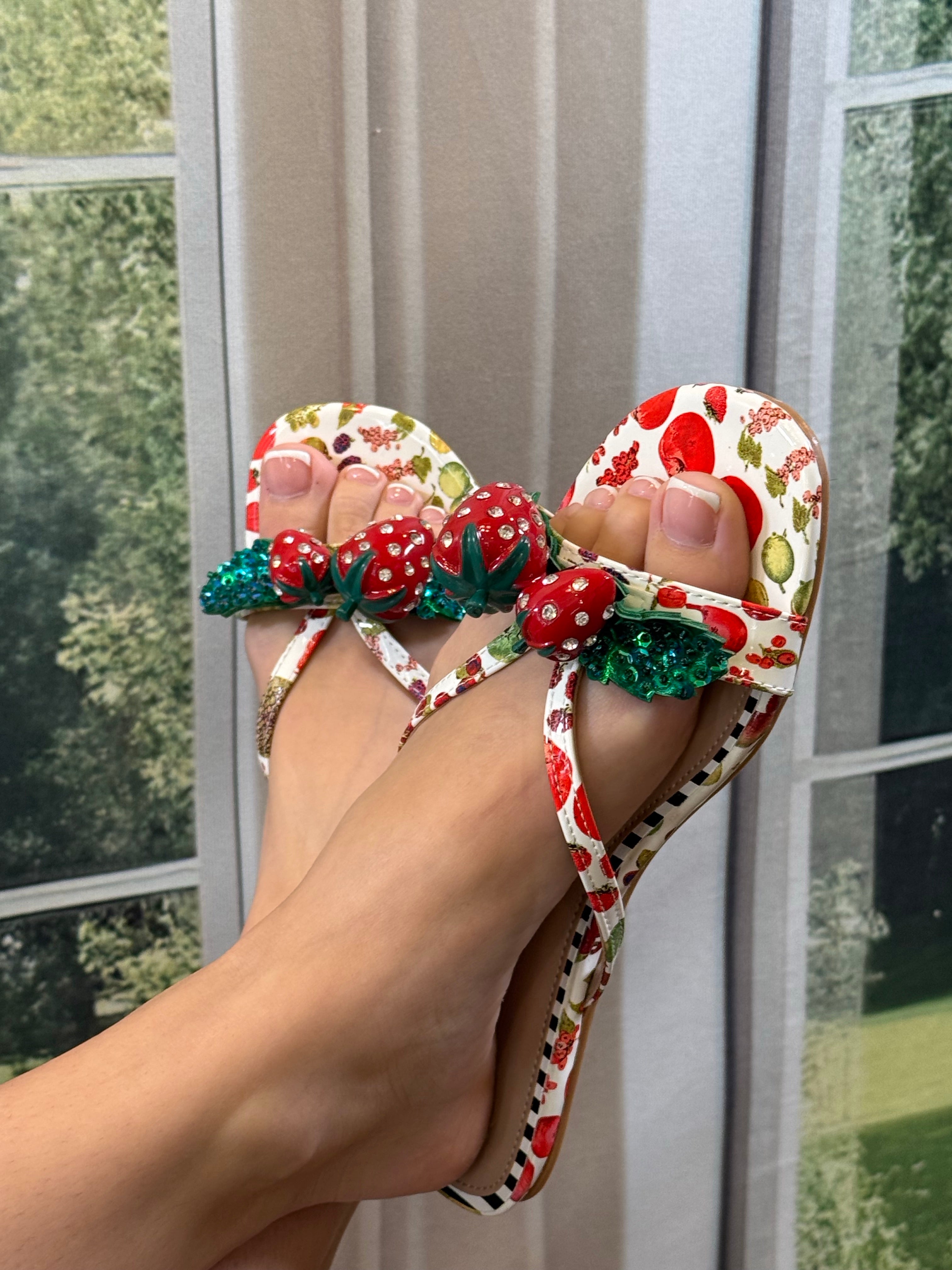 The Betsey Johnson Garrick White Multi Sandals feature decorative strawberry designs on the straps, enhancing both aesthetics and functionality. These sandals combine style with comfort, offering stability and support for extended wear. With a versatile design, they are suitable for various occasions, contributing to an effective footwear solution.