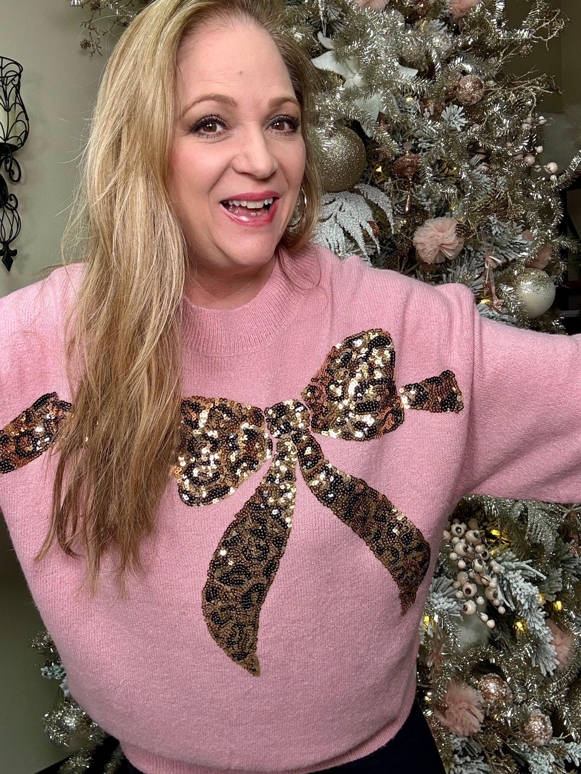 This Leopard Sequin Bow Light Pink Sweater is perfect for adding a touch of sparkle to your wardrobe. The sequin bow detail adds a stylish and playful element, while the light pink color is soft and feminine. Made with quality materials, this sweater is both comfortable and fashionable.