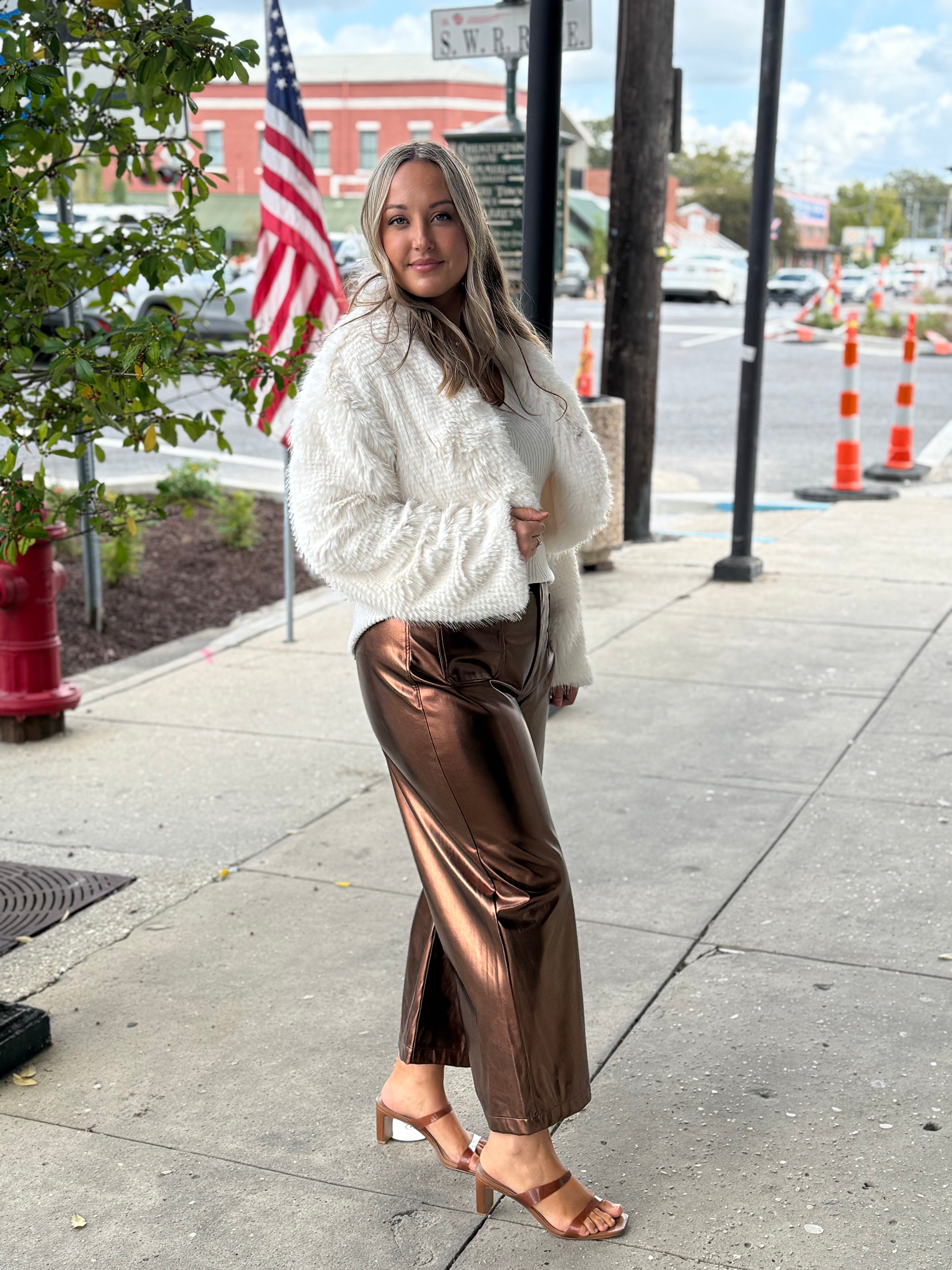 High rise wide leg clean hem pants in a vibrant rust copper foil.