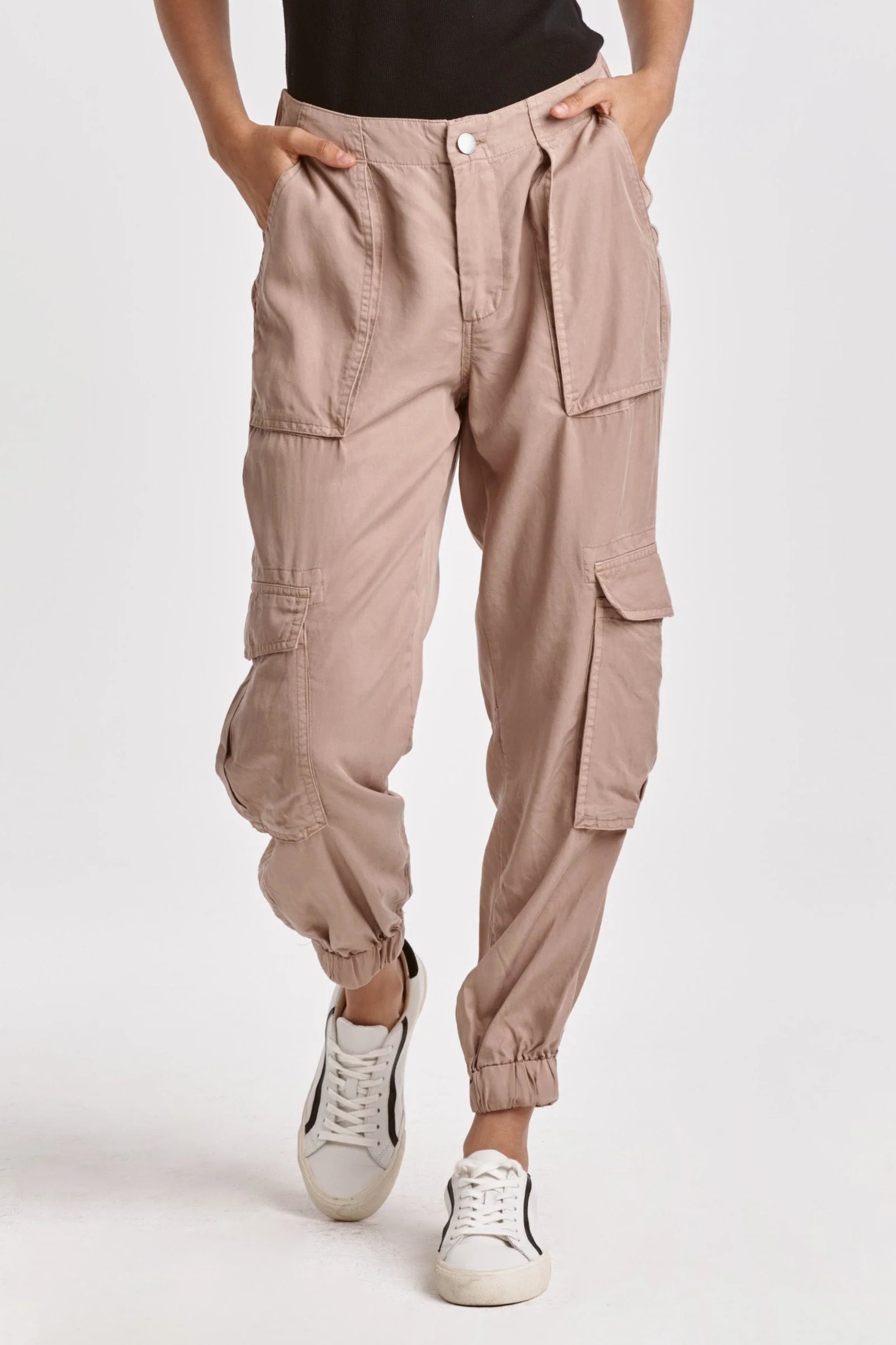 High rise SANDY cropped trouser pants with front utility; side cargo pockets, elastic waistband with shank button closure & cuff for adjustable utility wear.