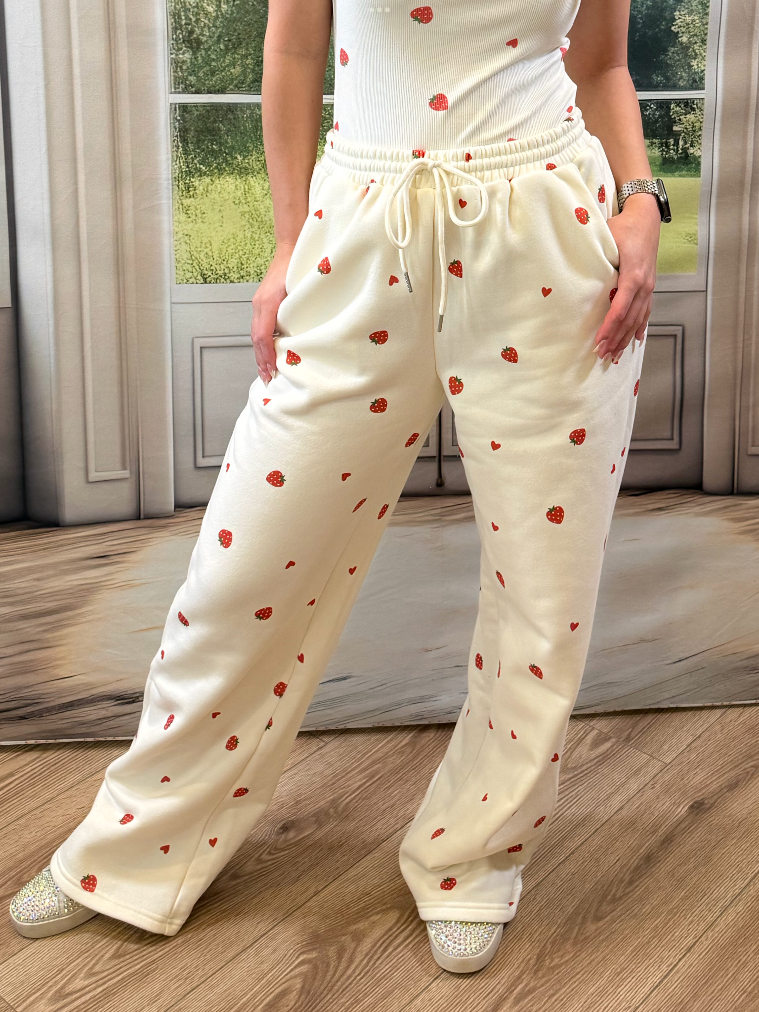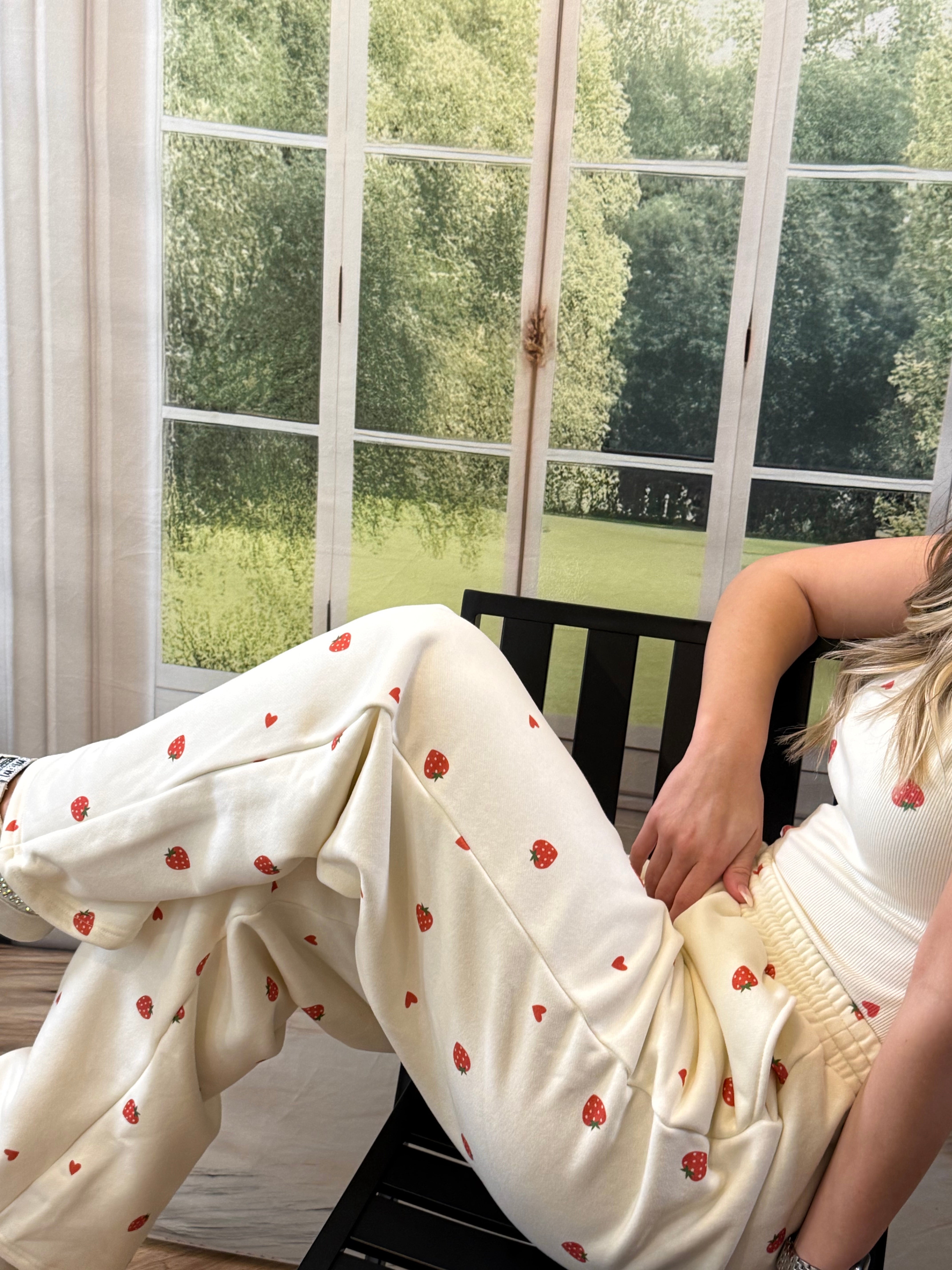 The Strawberry Print Sweatpants feature a unique design that combines comfort and style. Made from soft, breathable fabric, they offer a relaxed fit suitable for casual wear or lounging. The playful strawberry print adds an aesthetic touch, making these sweatpants an appealing choice for daily activities.