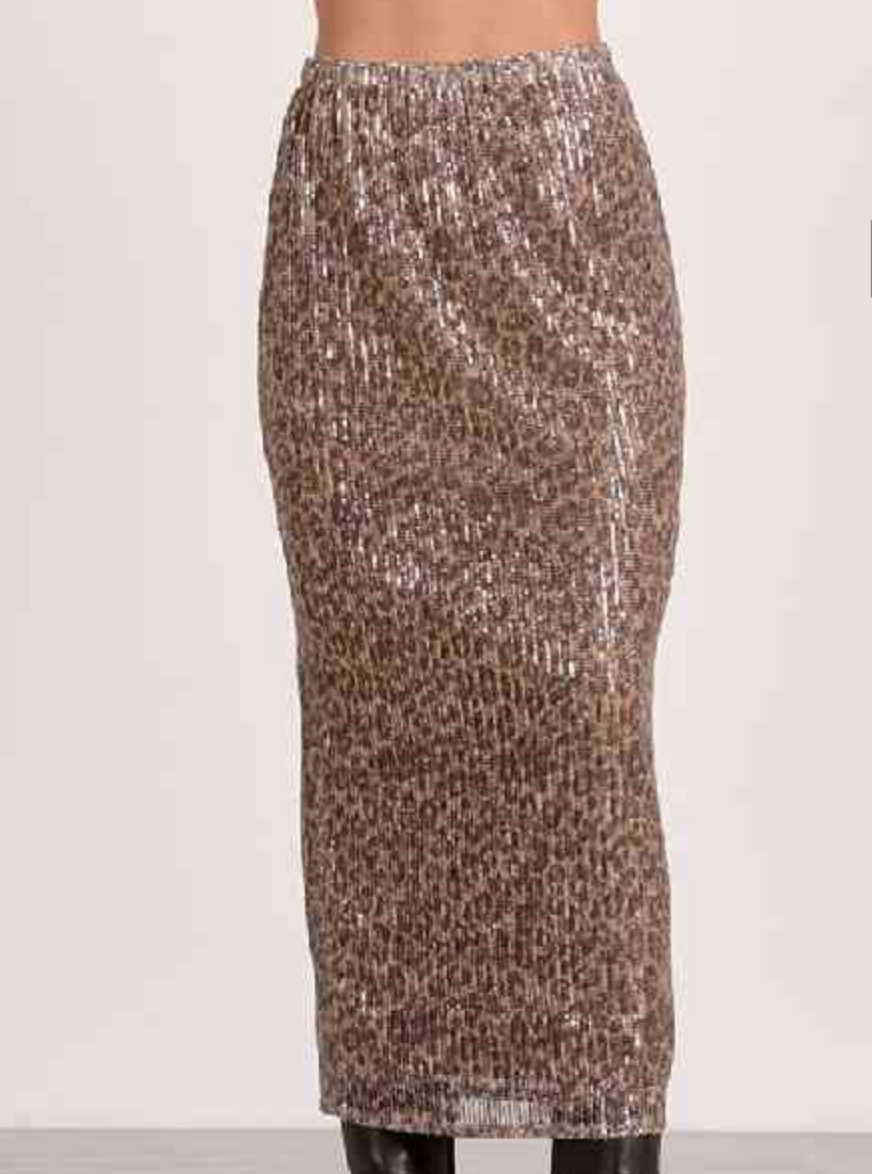 This Cheetah Print Sequin Maxi Skirt combines edgy and glamorous details. The cheetah print adds a touch of wildness while the sequin embellishments add a touch of elegance. Made with high-quality materials and expert craftsmanship, this skirt is sure to make a statement at any event.