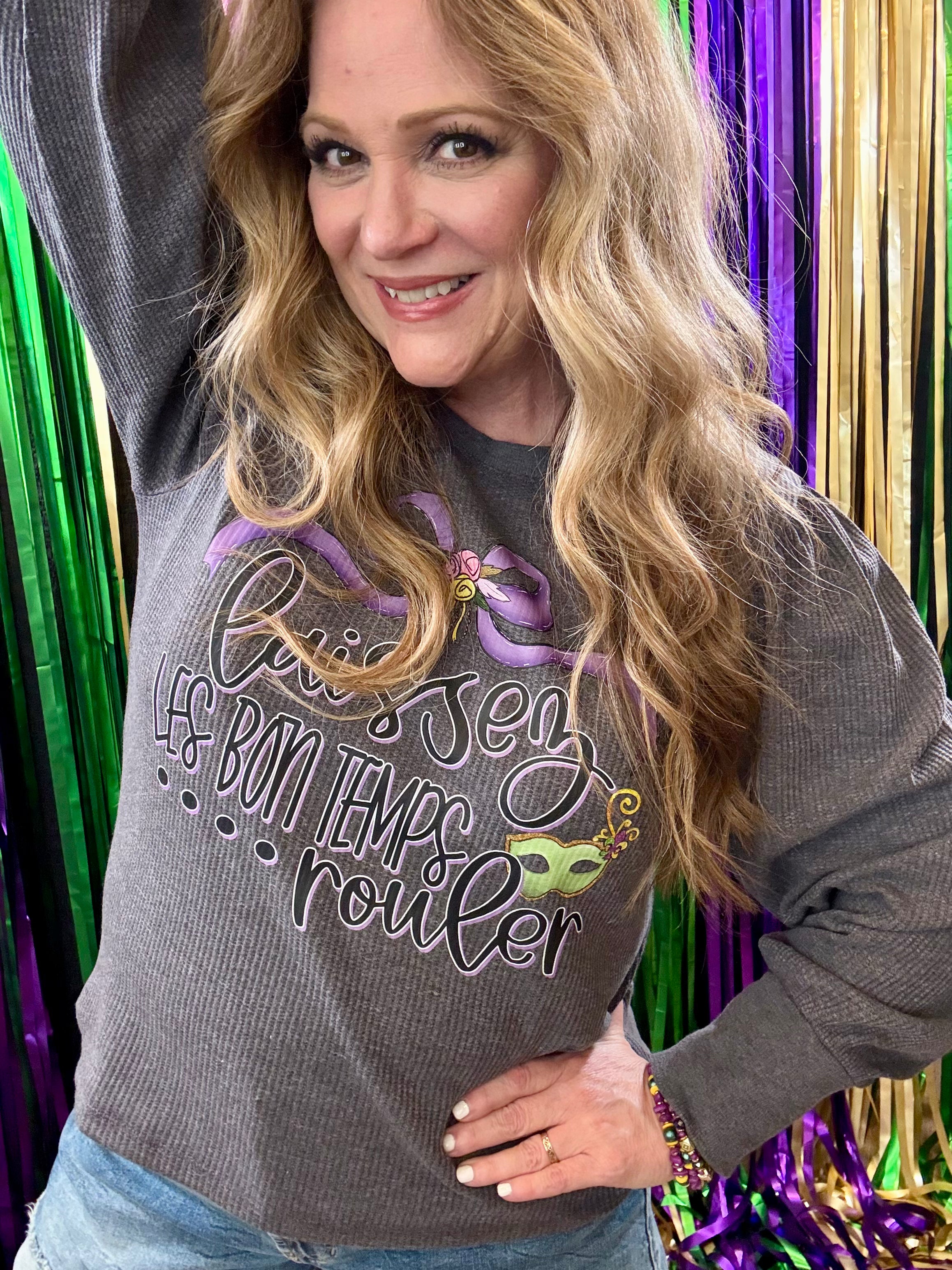 Enhance your wardrobe with the MG Bon Temps Rouler Top. Made with quality materials, this top offers both comfort and style. Its unique design and fit make it the perfect addition to any outfit. Embrace New Orleans vibes and let your style shine with this top.